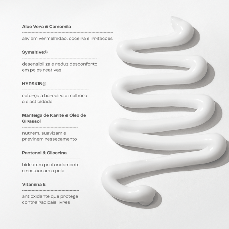 Peles secas e ressecadas tendem a sofrer com irritações. Esse hidratante é formulado com o exclusivo Symsitive® 1609 na composição, um importante ativo que promove alívio imediato contra os sintomas da sensibilidade, como vermelhidão, descamação e coceira.