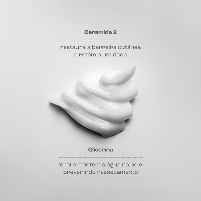 Água, Glicerol, Parafina Líquida, Petrolato, Dimeticona, Poliacrilato de Sódio, Ácido Estárico, Monoestearato de Glicerila, Fenoxietanol, Acetato de Tocoferila, Etilhexilglicerina, Gliconato de Sódio, Aminometilpropanol, Ceramida NG, Ácido Cítrico, Hidróxido de Potássio.