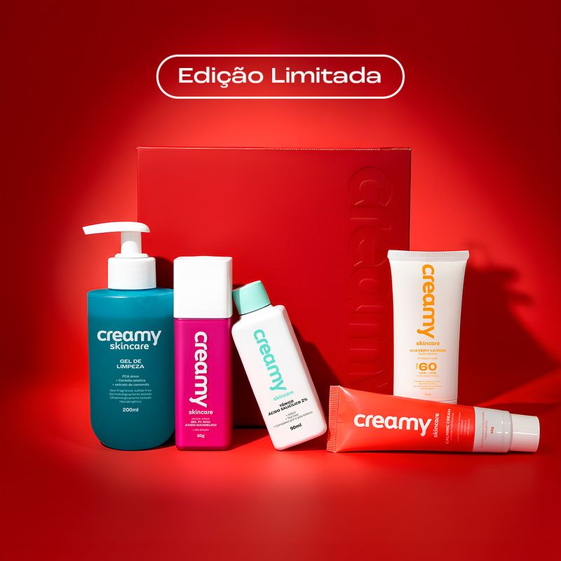 A Rotina Antiacne Completa da Creamy combina cinco etapas fundamentais para o cuidado da pele oleosa e acneica: limpeza, controle de oleosidade, cuidado, reparo da barreira e proteção solar. O Gel de Limpeza remove impurezas sem ressecar, o Tônico Ácido Salicílico atua diretamente nos poros e na acne, o Ácido Mandélico ajuda a uniformizar textura e marquinhas, o Calming Cream traz alívio e hidratação leve, enquanto o Protetor Solar protege a pele.