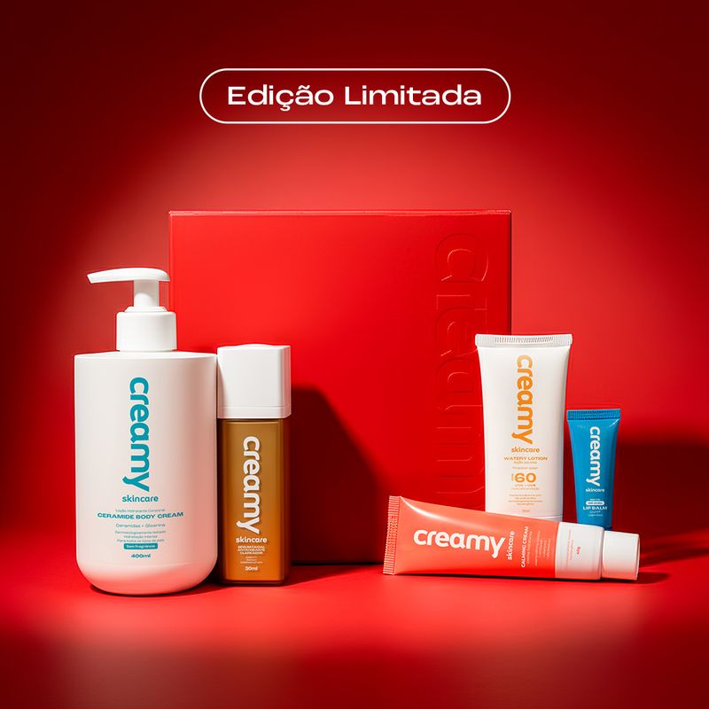 A Rotina Autocuidado Completo da Creamy combina etapas fundamentais para o cuidado diário: hidratação corporal, proteção antioxidante para o rosto, hidratação calmante, proteção solar e cuidado específico para os lábios. A Vitamina C Gold ajuda a uniformizar o tom e devolver luminosidade, o Calming Cream traz hidratação leve e conforto, o Ceramide Body Cream 400 ml hidrata intensamente o corpo, o Lip Balm Incolor cuida dos lábios, enquanto o Protetor Solar protege a pele contra os danos solares.