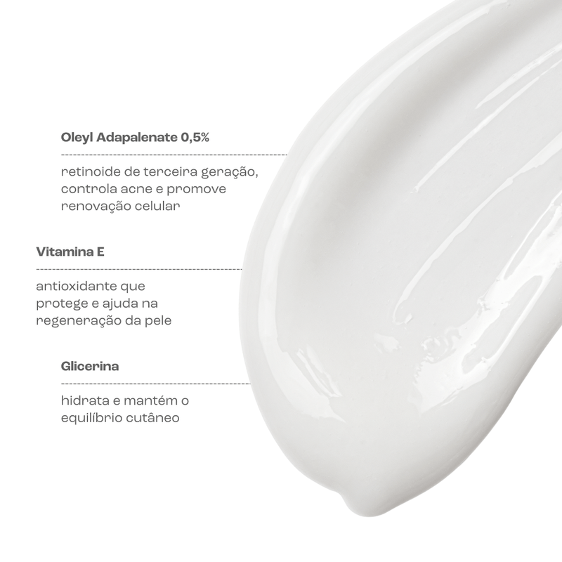 O SÉRUM FACIAL com Oleyl Adapalenate 0,5%, um retinóide de terceira geração, e por esta razão apresenta resultados mais rápidos e eficazes com maior tolerabilidade cutânea que outros retinóides. Além disso, auxilia no controle do brilho e na redução da oleosidade excessiva, sem irritar a pele. Apresenta efeito anti-aging com melhora de linhas finas e aparência geral da pele. Com uma tecnologia inovadora, entrega resultados rápidos e eficazes.